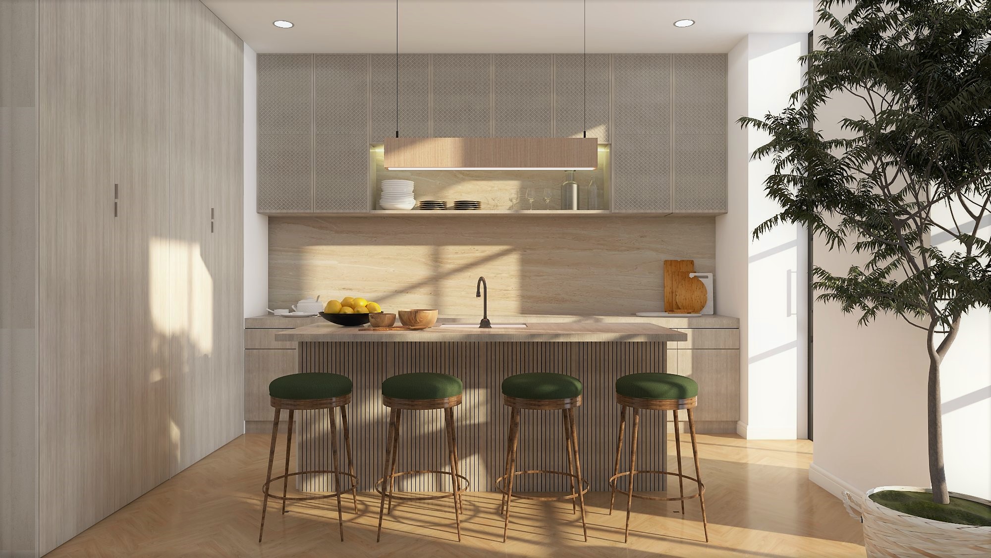 The interiors favor functionality over frills and mimic superior aesthetics. Timber stools, sisal rugs, terracotta pots, wool, raw wood, linen and hemp are great materials to integrate into your Japandi interior.